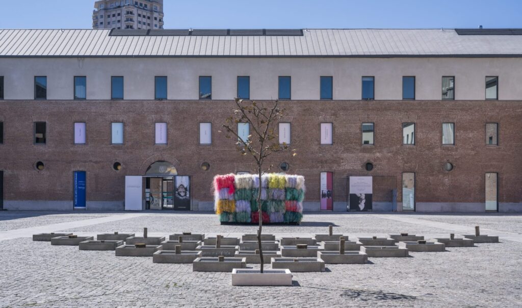 Línea rota de horizonte de Carlos Garaioca. (Centro Condeduque de Madrid). Esta obra comisariada por David Barro establece un diálogo con las estructuras de la ciudad y su relación con la naturaleza, en muchos casos maltratada y descuidada o, como en este caso, mutilada.