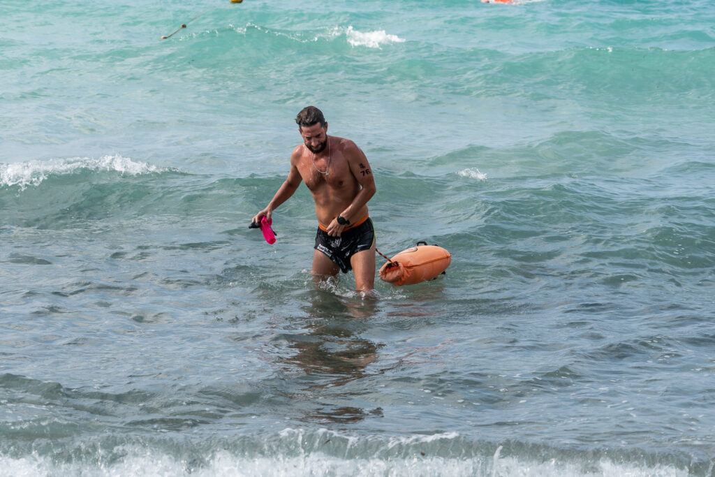 No fue nada fácil, al pasar la boya de Es Vedranell y emprender el regreso, nos metimos en un banco gigantesco de medusas, imposible escapar. Gritos de auxilio, nadadores con picaduras por todas partes,  seis en mi caso, agobio generalizado, pánico. En la lancha a la que me subí, una chica inglesa temblaba por la reacción alérgica y sacó de la boya un inhalador, en ese momento parecía claro que  abandonaríamos, pero la tía dijo: “quiero terminar la carrera, pero solo que sin medusas”, una auténtica valiente, la terminó, yo también. Luego enorme satisfacción, y comilona en Es Boldado, y al día siguiente al hospital a por una inyección de Urbason.