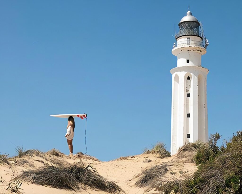 Faro de Trafalgar, Cádiz. El agua que se ve a lo lejos es azul turquesa, hoy se encrespa hacía el majestuoso faro, hay viento de levante, es caluroso y barre en rachas la fina arena de playa que se acumula entorno a palos, guijarros y piedras, se forman dunas de dibujos ondulados.
